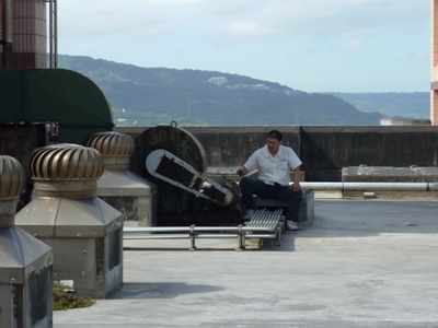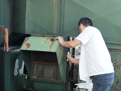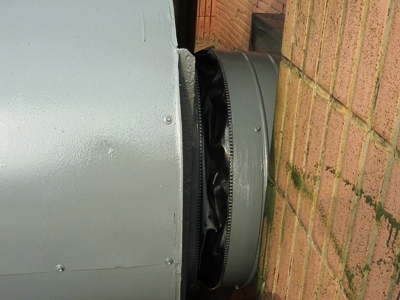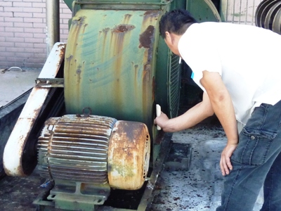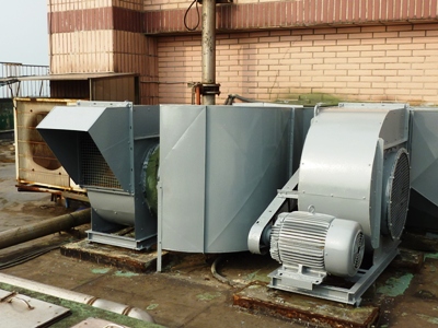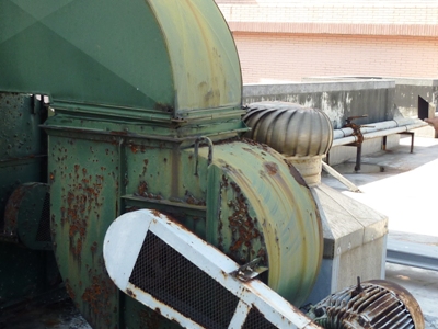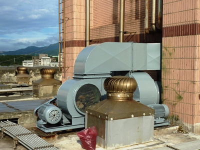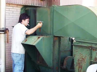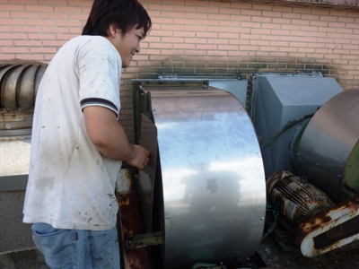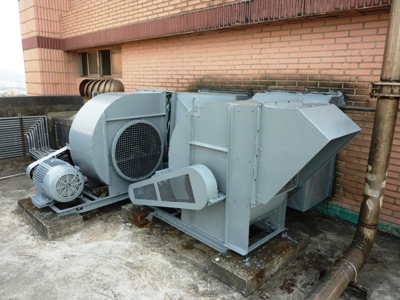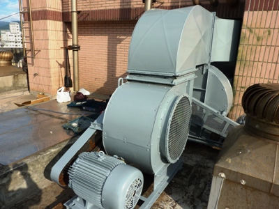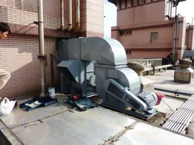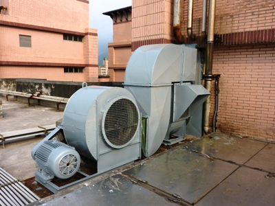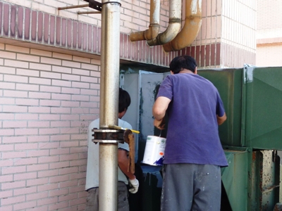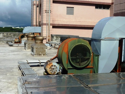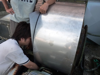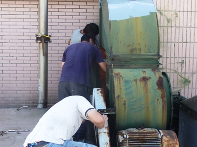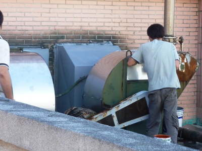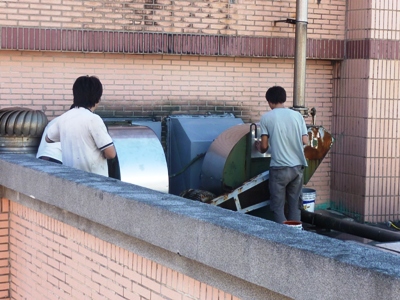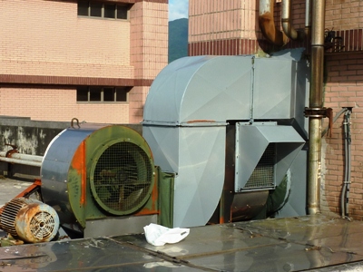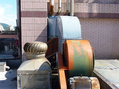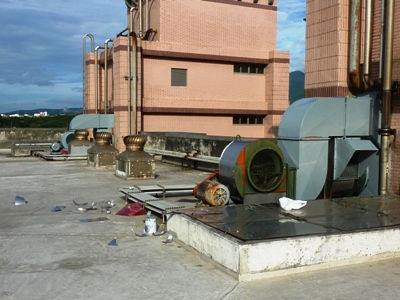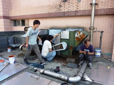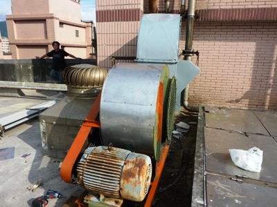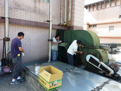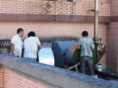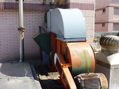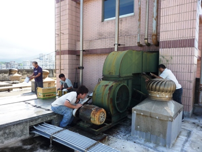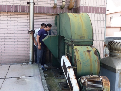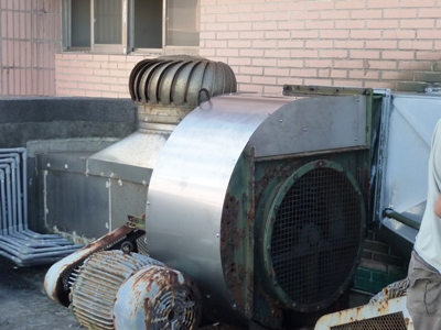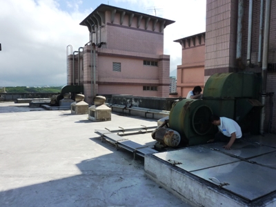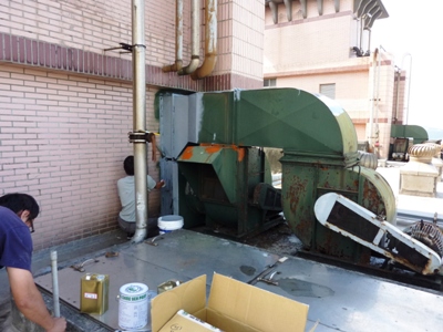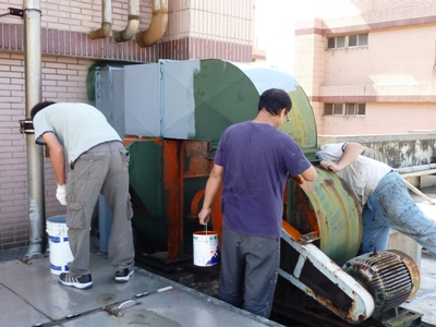 社區頂樓排風機外殼因為長年沒保養已破舊不堪,如不維修屆時會導致機器損壞無法啟動,對防火安全非常危險。此次修補將破裂嚴重用新白鐵包覆,其他部分用防鏽補漆